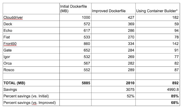 Applying this approach across each microservice yielded similar results; our sum total container footprint shrunk from almost 6GB down to less than 1GB.