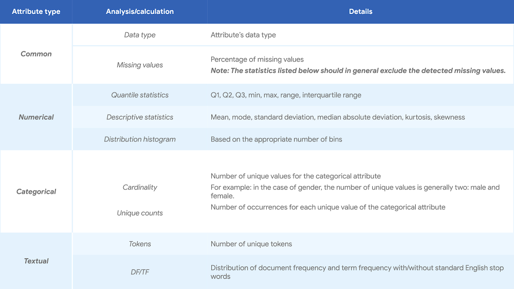 When you’re getting started with a machine learning (ML) project, one critical principle to keep in mind is that data is everything. It is often said that if ML is the rocket engine, then the fuel is the (high-quality) data fed to ML algorithms. However, deriving truth and insight from a pile of data can be a complicated and error-prone job. To have a solid start for your ML project, it always helps to analyze the data up front, a practice that describes the data by means of statistical and visualization techniques to bring important aspects of that data into focus for further analysis. During that process, it’s important that you get a deep understanding of: The properties of the data, such as schema and statistical properties;The quality of the data, like missing values and inconsistent data types;The predictive power of the data, such as correlation of features against target.This process lays the groundwork for the subsequent feature selection and engineering steps, and it provides a solid foundation for building good ML models. There are many different approaches to conducting exploratory data analysis (EDA) out there, so it can be hard to know what analysis to perform and how to do it properly. To consolidate the recommendations on conducting proper EDA, data cleaning, and feature selection in ML projects, we’ll summarize and provide concise guidance from both intuitive (visualization) and rigorous (statistical) perspectives. Based on the results of the analysis, you can then determine corresponding feature selection and engineering recommendations. You can also get more comprehensive instructions in this white paper.You can also check out the Auto Data Exploration and Feature Recommendation Tool we developed to help you automate the recommended analysis, regardless of the scale of the data, then generate a well-organized report to present the findings. EDA, feature selection, and feature engineering are often tied together and are important steps in the ML journey. With the complexity of data and business problems that exist today (such as credit scoring in finance and demand forecasting in retail), how the results of proper EDA can influence your subsequent decisions is a big question. In this post, we will walk you through some of the decisions you’ll need to make about your data for a particular project, and choosing which type of analysis to use, along with visualizations, tools, and feature processing.Let’s start exploring the types of analysis you can choose from. Statistical data analysisWith this type of analysis, data exploration can be conducted from three different angles: descriptive, correlation, and contextual. Each type introduces complementary information on the properties and predictive power of the data, helping you make an informed decision based on the outcome of the analysis.1. Descriptive analysis (univariate analysis)Descriptive analysis, or univariate analysis, provides an understanding of the characteristics of each attribute of the dataset. It also offers important evidence for feature preprocessing and selection in a later stage. The following table lists the suggested analysis for attributes that are common, numerical, categorical and textual.Click to enlarge2. Correlation analysis (bivariate analysis)Correlation analysis (or bivariate analysis) examines the relationship between two attributes, say X and Y, and examines whether X and Y are correlated. This analysis can be done from two perspectives to get various possible combinations:Qualitative analysis. This performs computation of the descriptive statistics of dependent numerical/categorical attributes against each unique value of the independent categorical attribute. This perspective helps intuitively understand the relationship between X and Y. Visualizations are often used together with qualitative analysis as a more intuitive way of presenting the result.Click to enlargeQuantitative analysis. This is a quantitative test of the relationship between X and Y, based on hypothesis testing framework. This perspective provides a formal and mathematical methodology to quantitatively determine the existence and/or strength of the relationship.Click to enlarge3. Contextual analysisDescriptive analysis and correlation analysis are both generic enough to be performed on any structured dataset, neither of which requires context information. To further understand or profile the given dataset and to gain more domain-specific insights, you can use one of two common contextual information-based analyses: Time-based analysis: In many real-world datasets, the timestamp (or a similar time-related attribute) is one of the key pieces of contextual information. Observing and/or understanding the characteristics of the data along the time dimension, with various granularities, is essential to understanding the data generation process and ensuring data qualityAgent-based analysis: As an alternative to the time, the other common attribute is the unique identification (ID, such as user ID) of each record. Analyzing the dataset by aggregating along the agent dimension, i.e., histogram of number of records per agent, can further help improve your understanding of the dataset. Example of time-based analysis:The following figure displays the average number of train trips per hour originating from and ending at one particular location based on a simulated dataset.From this, we can conclude that peak times are around 8:30am and 5:30pm, which is consistent with the intuition that these are the times when people would typically leave home in the morning and return after a day of work.Feature selection and engineeringThe ultimate goal of EDA (whether rigorous or through visualization) is to provide insights on the dataset you’re studying. This can inspire your subsequent feature selection, engineering, and model-building process. Descriptive analysis provides the basic statistics of each attribute of the dataset. Thos