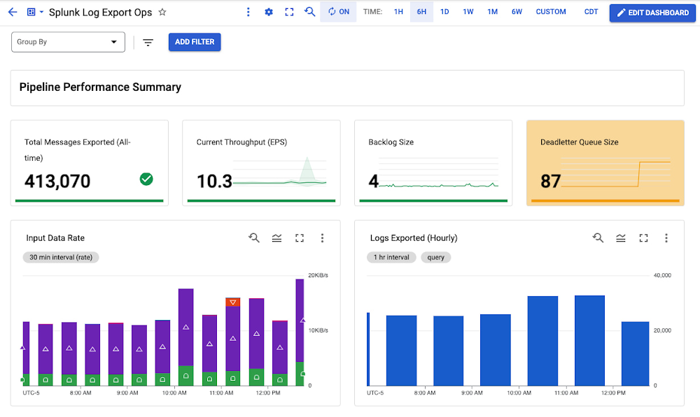 We’re thrilled to announce several new observability features for the Pub/Sub to Splunk Dataflow template to help operators keep a tab on their streaming pipeline performance. Splunk Enterprise and Splunk Cloud customers use the Splunk Dataflow template to reliably export Google Cloud logs for in-depth analytics for security, IT or business use cases. With newly added metrics and improved logging for Splunk IO sink, it’s now easier to answer operational questions such as:Is the Dataflow pipeline keeping up with the volume of logs generated?What is the latency and throughput (Event Per Second or EPS) when writing to Splunk?What is the response status breakdown of downstream Splunk HTTP Event Collector (HEC) and potential error messages?This critical visibility helps you derive your log export service-level indicators (SLIs) and monitor for any pipeline performance regressions. You can also more easily root cause potential downstream failures between Dataflow & Splunk such as Splunk HEC network connections or server issues, and fix the problem before it cascades. To help you quickly chart these new metrics, we’ve included them in the custom dashboard as part of the updated Terraform module for Splunk Dataflow. You can use those Terraform templates to deploy the entire infrastructure for log export to Splunk, or just the Monitoring dashboard alone.Log Export Ops Dashboard for Splunk DataflowMore metricsIn your Dataflow Console, you may have noticed several new custom metrics (highlighted below) for launched jobs as of template version 2022-03-21-00_RC01, that is gs://dataflow-templates/2022-03-21-00_RC01/Cloud_PubSub_to_Splunk or later:Pipeline instrumentationBefore we dive into the new metrics, let’s take a step back and go over the Splunk Dataflow job steps. The following flowchart represents the different stages that comprise a Splunk Dataflow job along with corresponding custom metrics:In this pipeline, we utilize two types of Apache Beam custom metrics:Counter metrics, labeled 1 through 10 above, used to count messages and requests (both successful and failed).Distribution metrics, labeled A through C above, used to report on distribution of request latency (both successful and failed) and batch size. Downstream request visibilitySplunk Dataflow operators have relied on some of these pre-built custom metrics to monitor log messages progress through the different pipeline stages, particularly in the last stage Write To Splunk, with metrics outbound-successful-events (counter #6 above) and outbound-failed-events (counter #7 above) to track the number of messages that were successfully exported (or not) to Splunk. While operators had visibility of the outbound message success rate, they lacked visibility at the HEC request level. Splunk Dataflow operators can now monitor not only the number of successful and failed HEC requests over time, but also the response status breakdown to determine if request failed due to a client request issue (e.g. invalid Splunk index or HEC token), or a transient network or Splunk issue (e.g. server busy or down) all from Dataflow Console with the addition of counters #7-10 above, that is:http-valid-requestshttp-invalid-requestshttp-server-error-requestsSplunk Dataflow operators can also now track average latency of downstream requests to Splunk HEC, as well as average request batch size, by using the new distribution metrics #A-C, that is:successful_write_to_splunk_latency_msunsuccessful_write_to_splunk_latency_mswrite_to_splunk_batchNote that a Distribution metric in Beam is reported by Dataflow as four sub-metrics suffixed with _MAX, _MIN, _MEAN and _COUNT. That is why those 3 new distribution metrics translate to 12 new metrics in Cloud Monitoring, as you can see in the earlier job info screenshot from Dataflow Console. Dataflow currently does not support creating a histogram to visualize the breakdown of these metrics’ values. Therefore, _MEAN metric is the only useful sub-metric for our purposes. As an all-time average value, _MEAN cannot be used to track changes over arbitrary time intervals (e.g. hourly), but it is useful to capture baseline, track trend or to compare different pipelines.Dataflow custom metrics, including aforementioned metrics reported by Splunk Dataflow template, are a chargeable feature of Cloud Monitoring. For more information on metrics pricing, see Pricing for Cloud Monitoring.Improved loggingLogging HEC errorsTo further root cause downstream issues, HEC request errors are now adequately logged, including both response status code and message:You can retrieve them directly in Worker Logs from Dataflow Console by setting log severity to Error.Alternatively, for those who prefer using Logs Explorer, you can use the following query.code_block[StructValue([(u’code’, u’log_id(“dataflow.googleapis.com/worker”)rnresource.type=”dataflow_step”rnresource.labels.step_id=”WriteToSplunk/Write Splunk events”rnseverity=ERROR’), (u’language’, u”)])]Disabling batch logsBy default, Splunk Dataflow workers log every HEC request as follows:Even though these requests are often batched events, these ‘batch logs’ are chatty as they add 2 log messages for every HEC request. With the addition of request-level counters (http-*-requests), latency & batch size distributions, and HEC error logging mentioned above, these batch logs are generally redundant. To control worker log volume, you can now disable these batch logs by setting the new optional template parameter enableBatchLogs to false, when deploying the Splunk Dataflow job. For more details on latest template parameters, refer to template user documentation.Enabling debug level logsThe default logging level for Google provided templates written using the Apache Beam Java SDK is INFO, which means all messages of INFO and higher i.e. WARN and ERROR will be logged. If you’d like to enable lower log levels like DEBUG, you can do so by setting the –defaultWorke