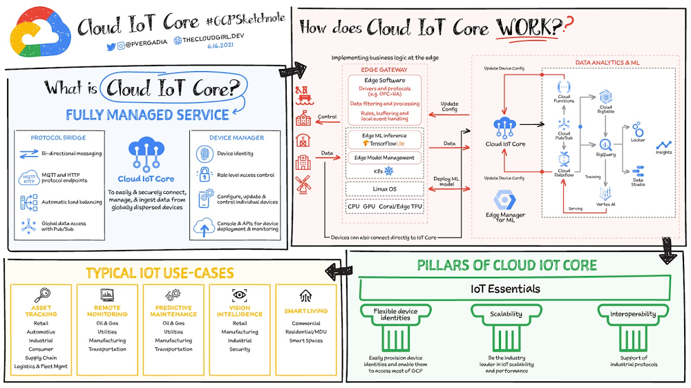 Click to enlargeThe ability to gain real-time insights from IoT data can redefine competitiveness for businesses. Intelligence allows connected devices and assets to interact efficiently with applications and with human beings in an intuitive and non-disruptive way. After your IoT project is up and running, many devices will be producing lots of data. You need an efficient, scalable, affordable way to both manage those devices and handle all that information. IoT Core is a fully managed service for managing IoT devices. It supports registration, authentication, and authorization inside the Google Cloud resource hierarchy as well as device metadata stored in the cloud, and the ability to send device configuration from other GCP or third-party services to devices. Main componentsThe main components of Cloud IoT Core are the device manager and the protocol bridges:The device manager  registers devices with the service, so you can then monitor and configure them. It provides:Device identity management Support for configuring, updating, and controlling individual devicesRole-level access controlConsole and APIs for device deployment and monitoringTwo protocol bridges (MQTT and HTTP) can be used by devices to connect to Google Cloud Platform for:Bi-directional messagingAutomatic load balancingGlobal data access with Pub/SubHow does Cloud IoT Core work?Device telemetry data is forwarded to a Cloud Pub/Subtopic, which can then be used to trigger Cloud Functions as well as other third-party apps to consume the data. You can also perform streaming analysis with Dataflow or custom analysis with your own subscribers.Cloud IoT Core supports direct device connections as well as gateway-based architectures. In both cases the real time state of the device and the operational data is ingested into Cloud IoT Core and the key and certificates at the edge are also managed by Cloud IoT Core. From Pub/Sub the raw input is fed into Dataflow for transformation, and the cleaned output is populated in Cloud Bigtable for real-time monitoring or BigQueryfor warehousing and machine learning. From BigQuery the data can be used for visualization in Looker orData Studio and it can be used in Vertex AI for creating machine learning models. The models created can be deployed at the edge using Edge Manager (in experimental phase). Device configuration updates or device commands can be triggered by Cloud Functions or Dataflow to Cloud IoT Core, which then updates the device.  Design principles of Cloud IoT CoreAs a managed service to securely connect, manage, and ingest data from global device fleets, Cloud IoT COre is designed to be:Flexible, providing easy provisioning of device identities and enabling devices to access most of Google CloudIThe industry leader in IoT scalability and performance Interoperable, with supports for the most common industry-standard IoT protocolsUse casesIoT use cases range across numerous industries. Some typical examples include:Asset tracking, visual inspection, and quality control in retail, automotive, industrial, supply chain and logisticsRemote monitoring and predictive maintenance in oil & gas, utilities, manufacturing, and transportationConnected homes and consumer technologies.Vision intelligence in retail, security, manufacturing, and industrial sectorsSmart living in commercial, residential, and smart spaces Smart factories with predictive maintenance and real-time plant floor analytics For a more in-depth look into Cloud IoT Core check out the documentation.  For more #GCPSketchnote, follow the GitHub repo. For similar cloud content follow me on Twitter @pvergadia and keep an eye out on thecloudgirl.dev.Related Article5 cheat sheets to help you get started on your Google Cloud journeyWhether you need to determine the best way to move to the cloud, or decide on the best storage option, we’ve built a number of cheat shee…Read Article